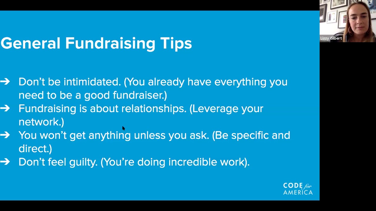 Each month, we discuss a topic relevant to the Code for America Network. In May, we discussed fundraising tactics for your Brigade. We want to help support you as you look to reach your funding goals. Join the Code for America Development Team to talk about ways to explore fundraising avenues for your Brigade! Come with questions and ideas, we look forward to seeing you there.